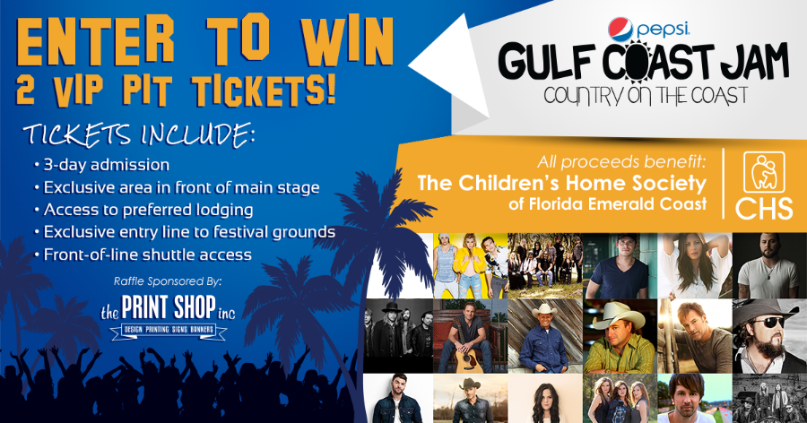 The Print Shop is very proud to announce that we are promoting our first Gulf Coast Jam 3 Day VIP Pit Tickets Giveaway benefiting the Children's Home Society of Florida - Emerald Coast! We are going to provide 100% of all funds raised with our giveaway to this amazing foundation, which needs our help.
